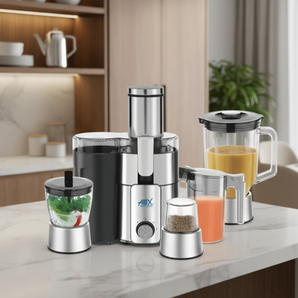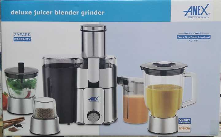 Anex AG-191 Deluxe Juicer Blender & Grinder – A durable 600W 5-in-1 appliance for juicing, blending, and grinding. With stainless steel housing, wide feed tube, safety system, and multiple jars, it’s the perfect all-in-one kitchen solution with 2-year warranty.