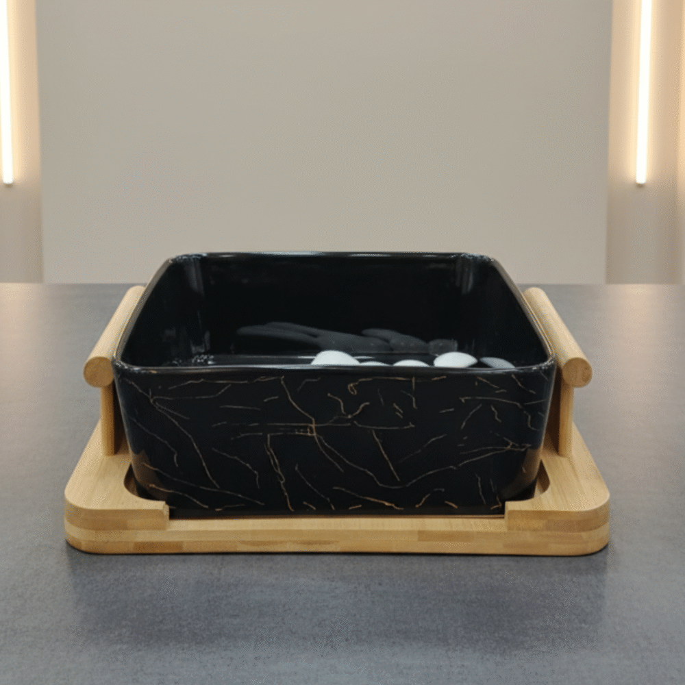 Add a touch of sophistication to your dining table with this Black Marble Ceramic Bowl with Wooden Base. Crafted from high-quality ceramic, it features a sleek marble design with subtle gold streaks, complemented by a sturdy wooden holder for a natural and modern aesthetic. Ideal for serving snacks, sauces, soups, or even desserts — this piece blends functionality with refined elegance, making it a must-have for every modern home.