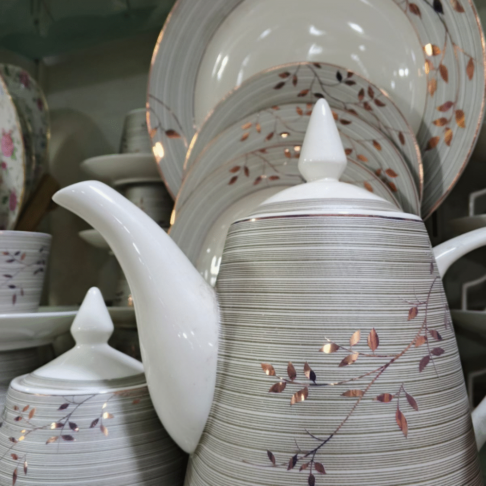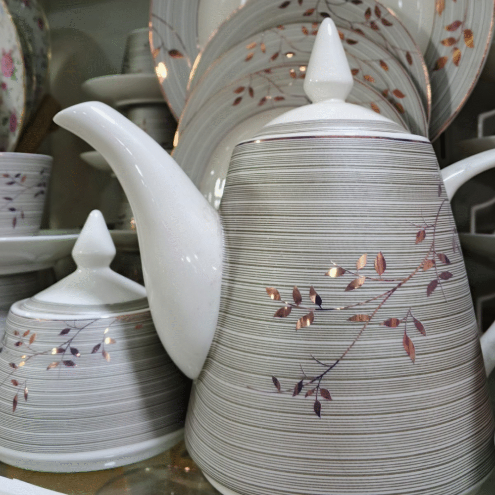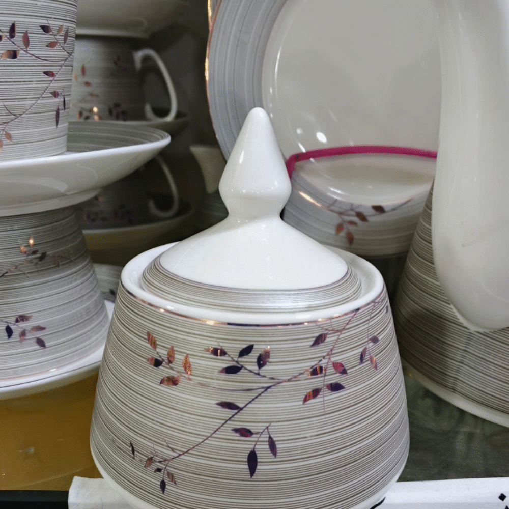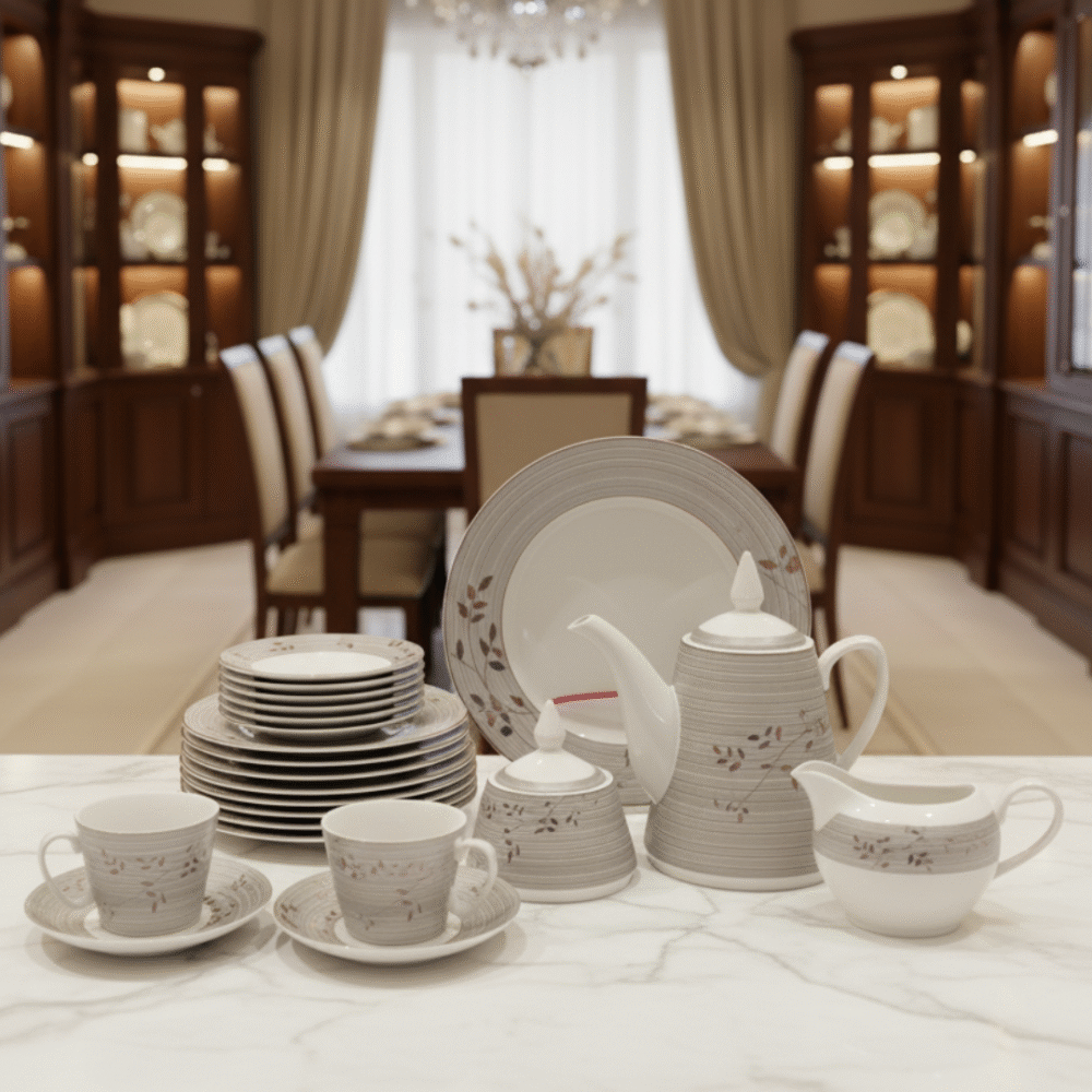 Add timeless elegance to your dining table with our Classic Floral Dinner & Tea Set. Crafted from high-quality ceramic, this 24-piece set features a soothing grey and white design with delicate floral accents. It includes plates, cups, saucers, a teapot, sugar pot, milk jug, and more — everything you need for both dining and tea service.