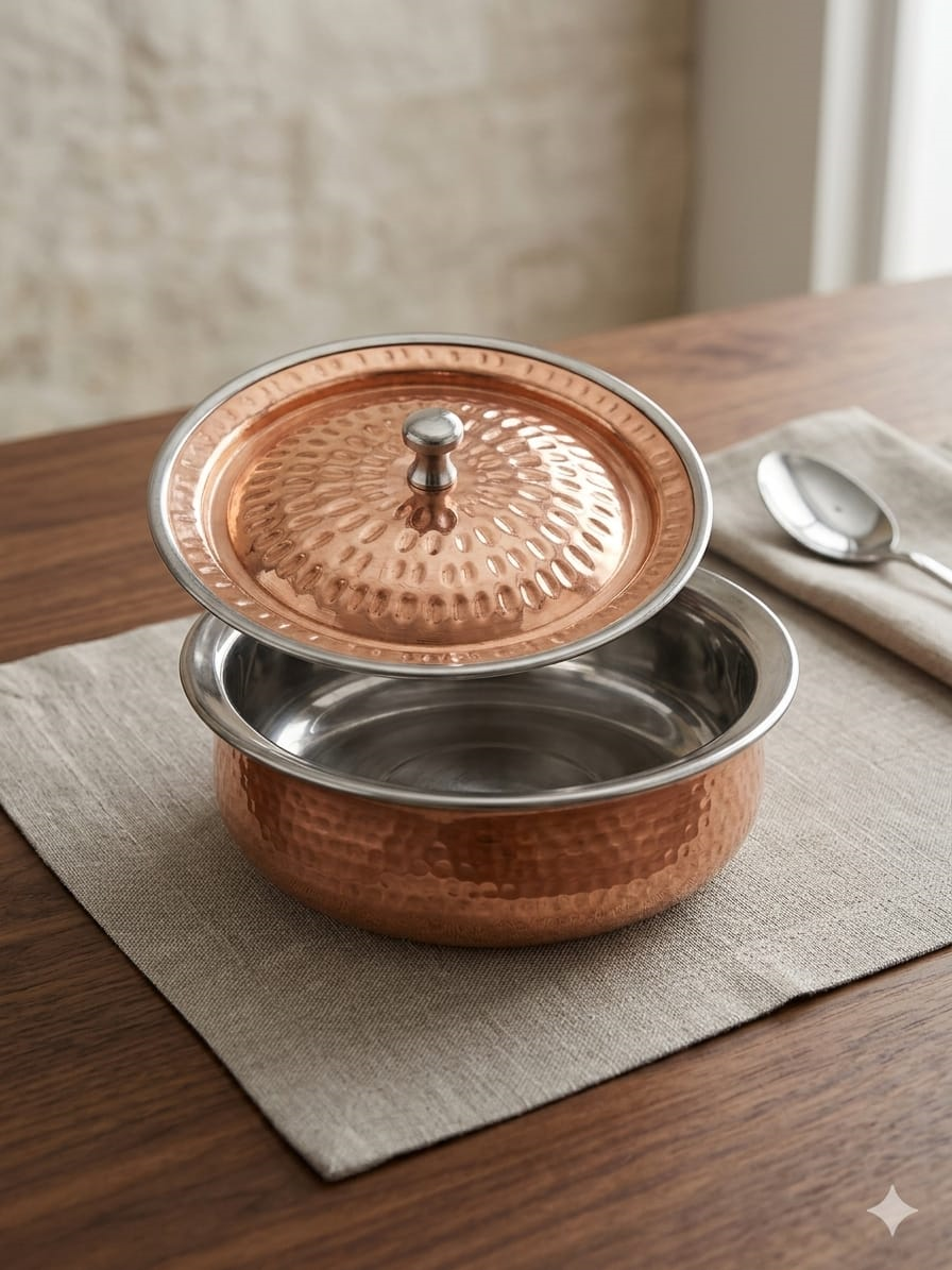 Elevate your dining experience with our exquisite Copper Steel Serving Handi. Crafted with a high-quality hammered copper exterior and a food-grade stainless steel interior, this handi combines traditional aesthetics with modern durability. Perfect for serving biryani, curries, and daal, it features a snug-fitting lid to keep your meals warm and fresh. A must-have for every elegant dinner table