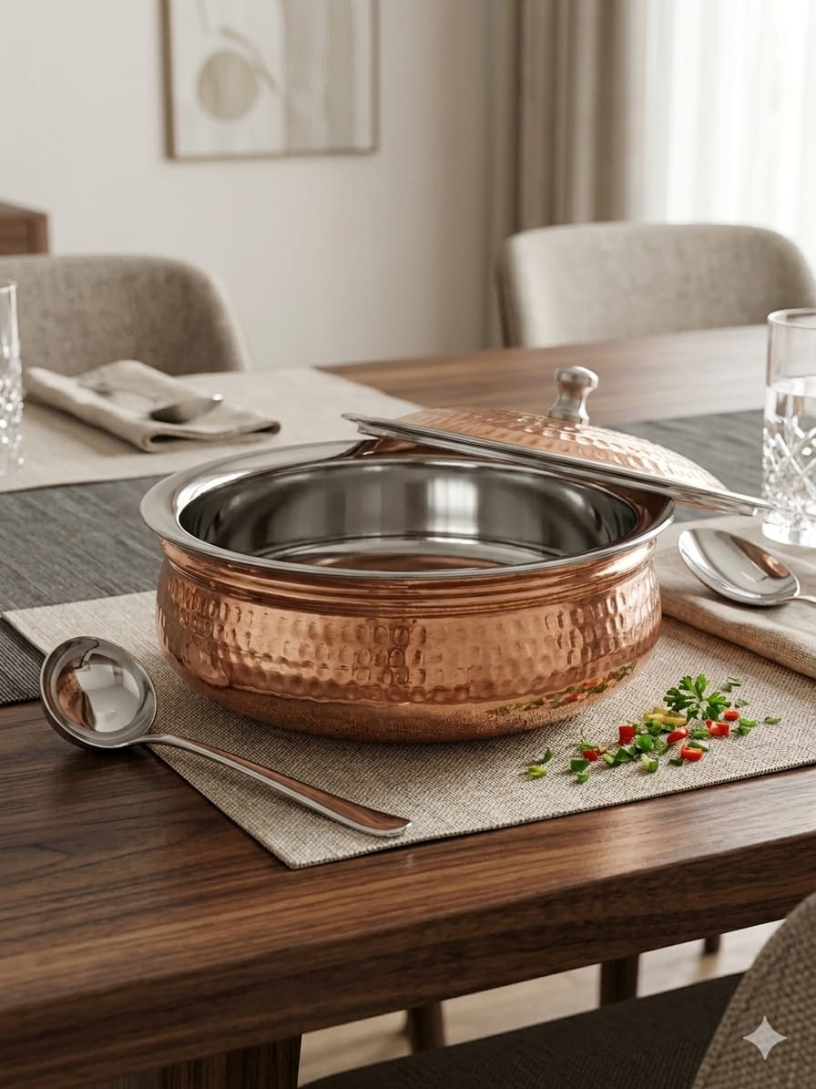 Bring the charm of traditional Indian/Pakistani fine dining to your home with our Premium Copper Steel Serving Handi. This handi is not just a utensil; it is a centerpiece designed to impress your guests and enhance the presentation of your culinary creations
