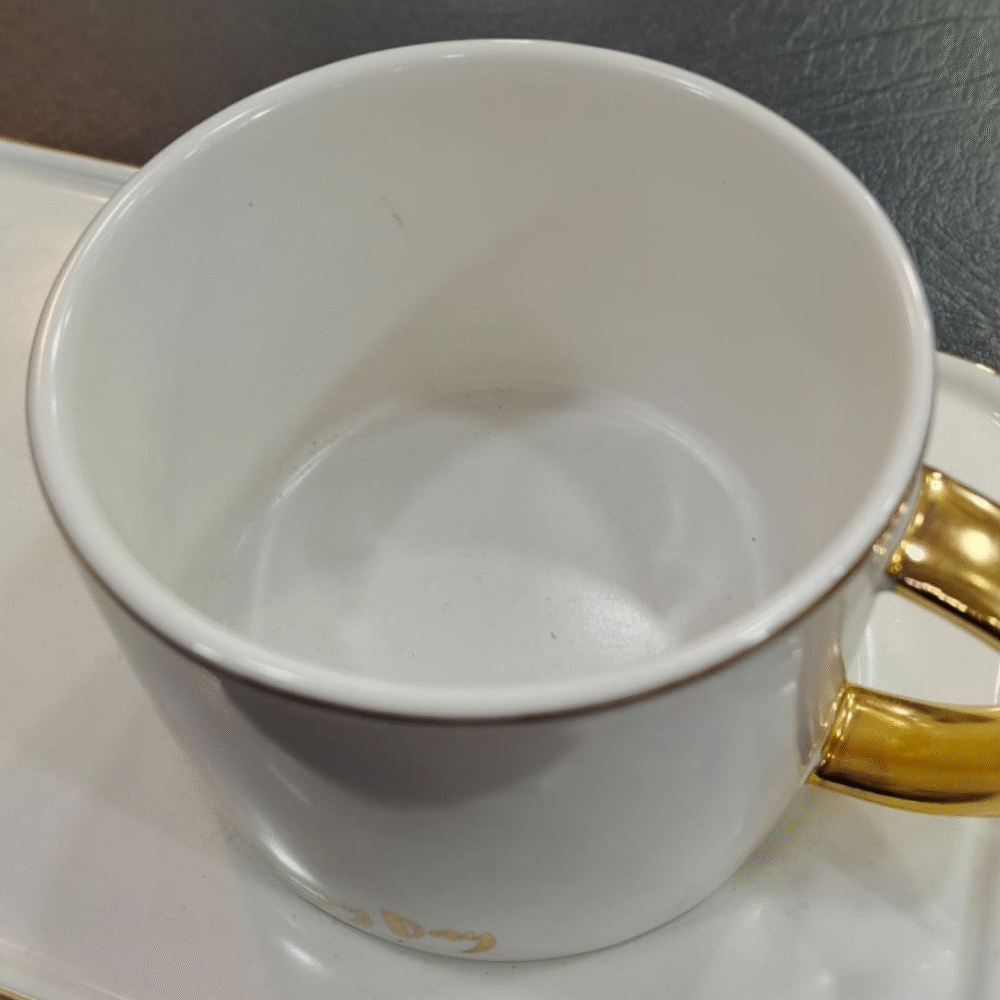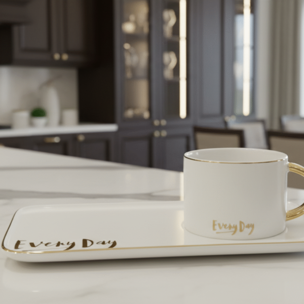 Add elegance to your daily routine with this EveryDay Ceramic Cup & Tray Set. Crafted with fine ceramic material and highlighted by a golden rim and handle, this set combines minimalism with luxury. The rectangular tray features the word “EveryDay” in gold print, giving it a modern and classy look.