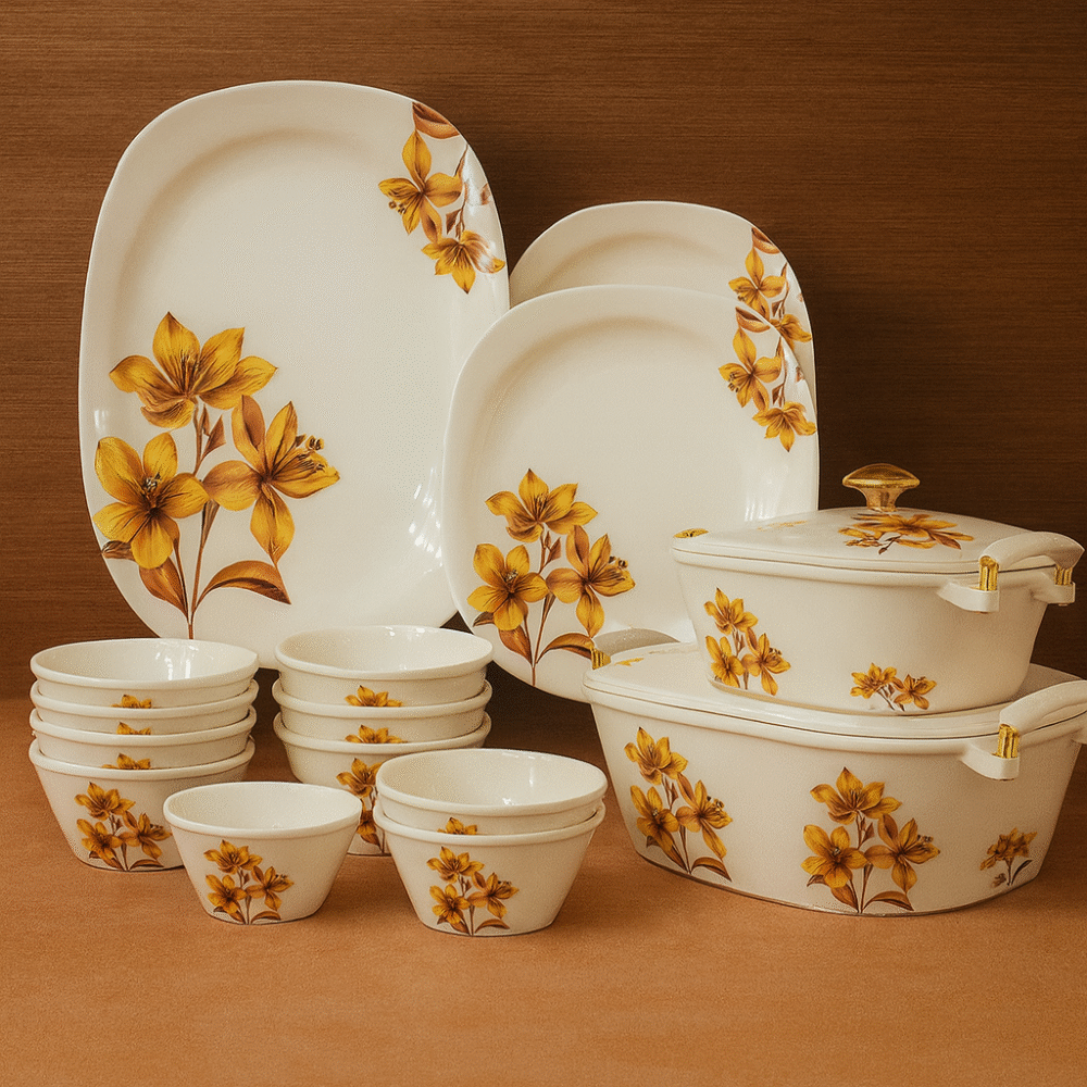 Bring warmth, charm, and elegance to your dining table with the Golden Bloom Premium Dinner Set, beautifully crafted with vibrant yellow floral patterns on smooth ivory ceramic. This set blends classic sophistication with modern design, making it perfect for both daily meals and special gatherings.