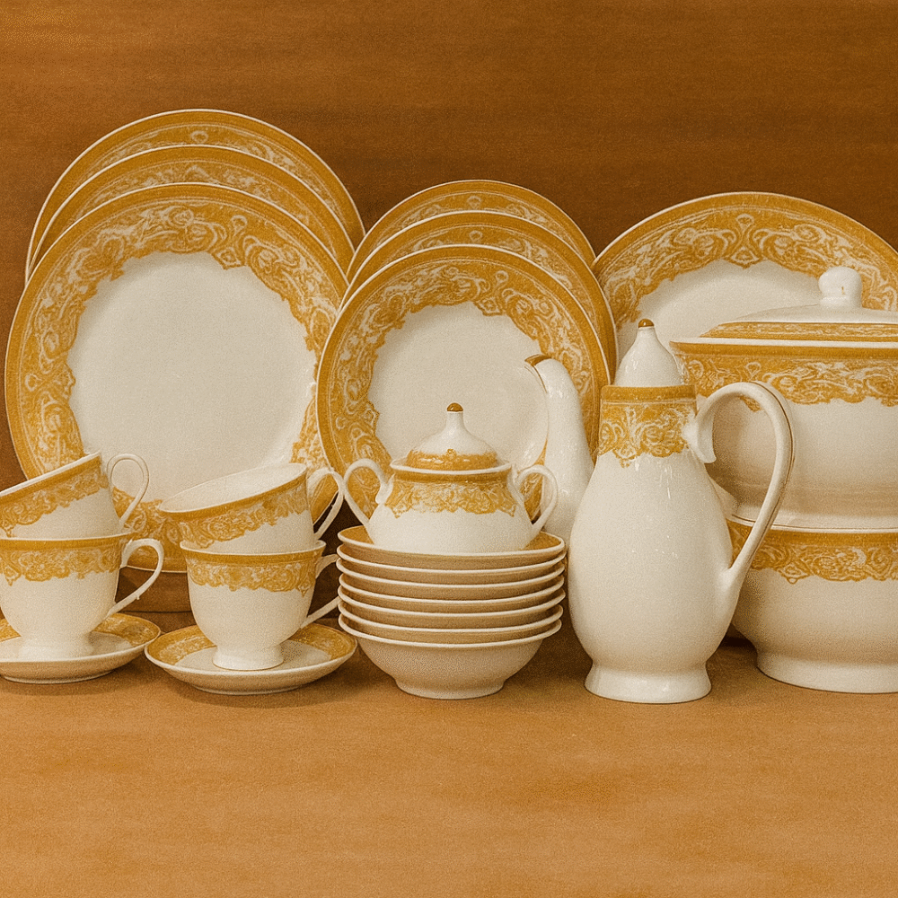 Each piece features a stunning golden ornamental border, delicately printed on high-quality porcelain with a smooth ivory base. The exquisite detailing and refined glossy finish make this set ideal for both everyday use and grand occasions.