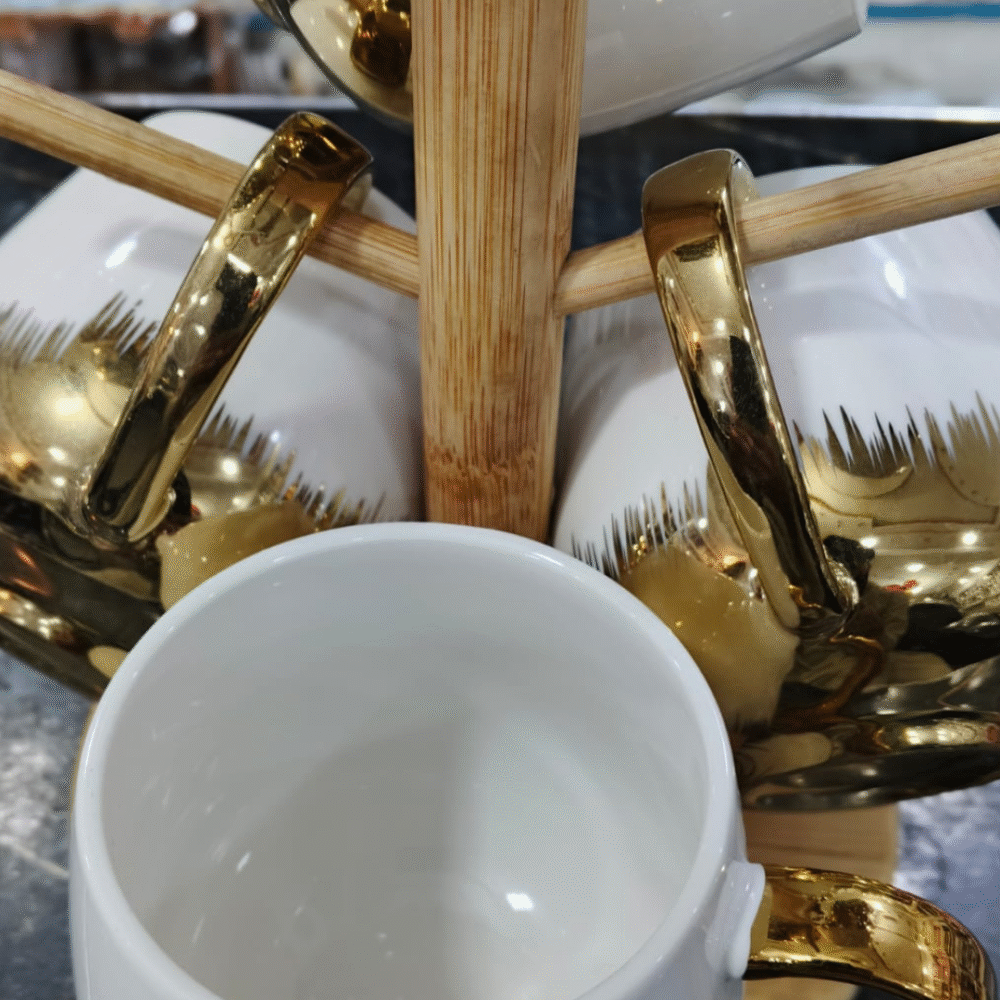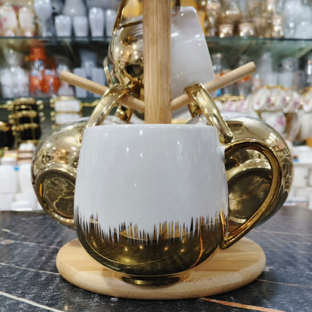 Add luxury to your kitchen with this Golden Shine Ceramic Mug Set featuring a beautiful gold-and-white design that radiates sophistication. Each mug is crafted from high-quality ceramic, ensuring durability and a comfortable grip. The set includes a natural wooden stand, offering a convenient and elegant way to organize and display your mugs.