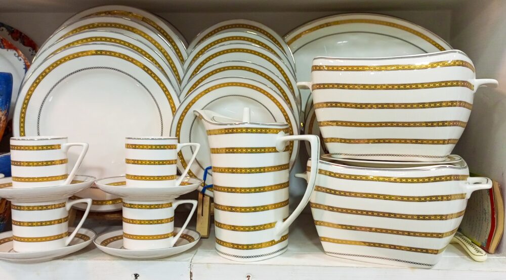 Stylish porcelain dinner set with gold stripe design — perfect for modern luxury dining and family occasions.