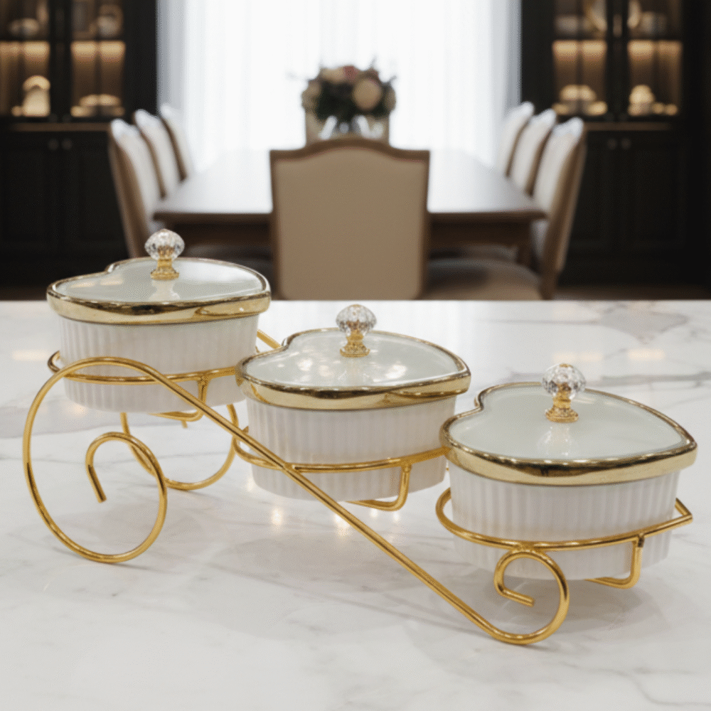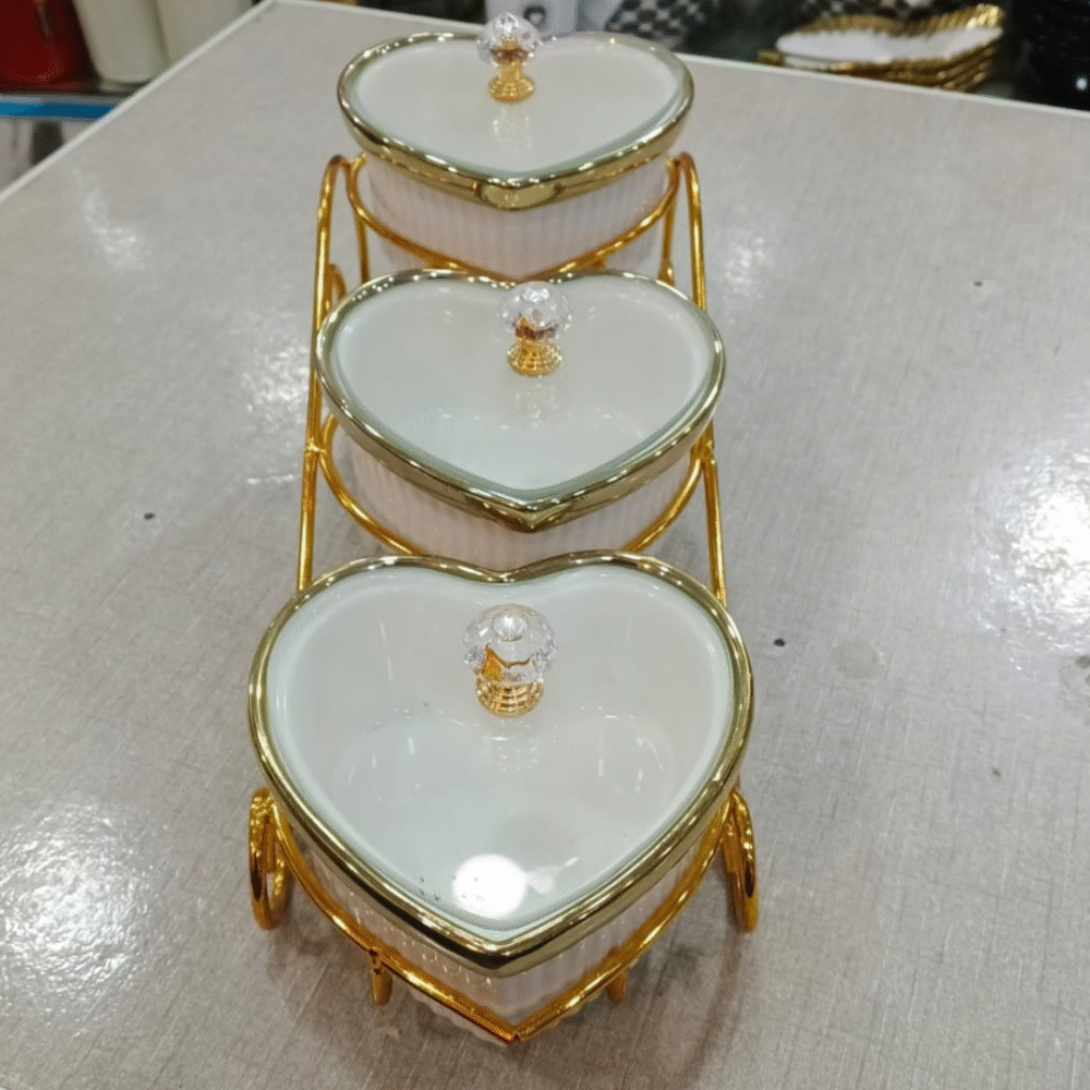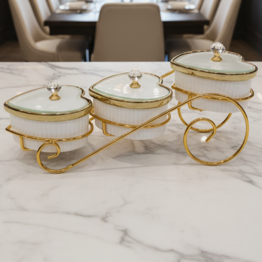 Bring elegance and romance to your dining experience with this Heart-Shaped Luxury Ceramic Condiment Set. Designed with premium white ceramic bowls, gold-finished rims, and sparkling crystal knobs, this set rests gracefully on a golden metal stand. Ideal for serving sauces, spices, sweets, or dry fruits, it combines functionality with timeless beauty. Perfect for festive dinners, high tea, or as a thoughtful gift for loved ones.