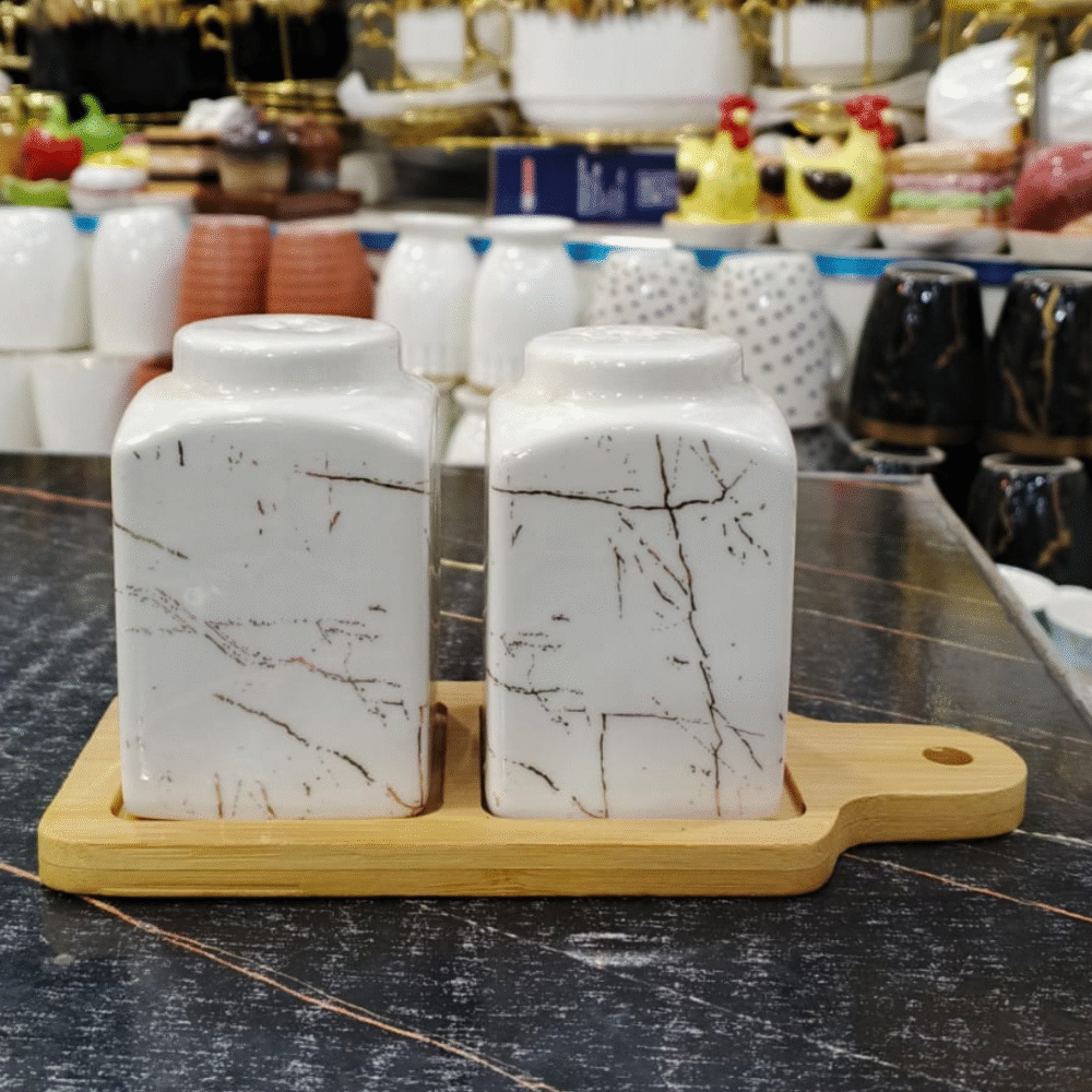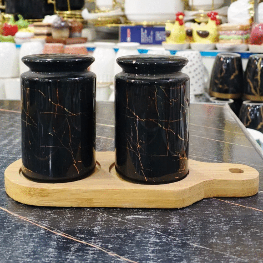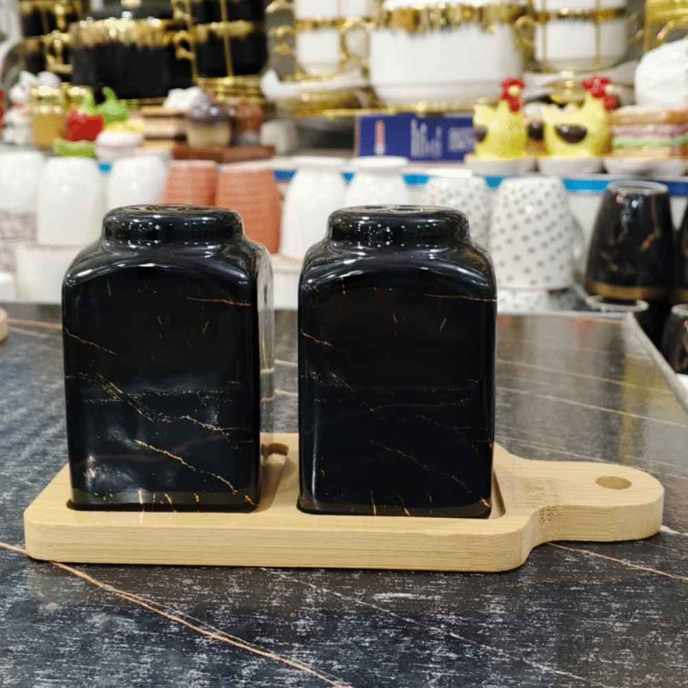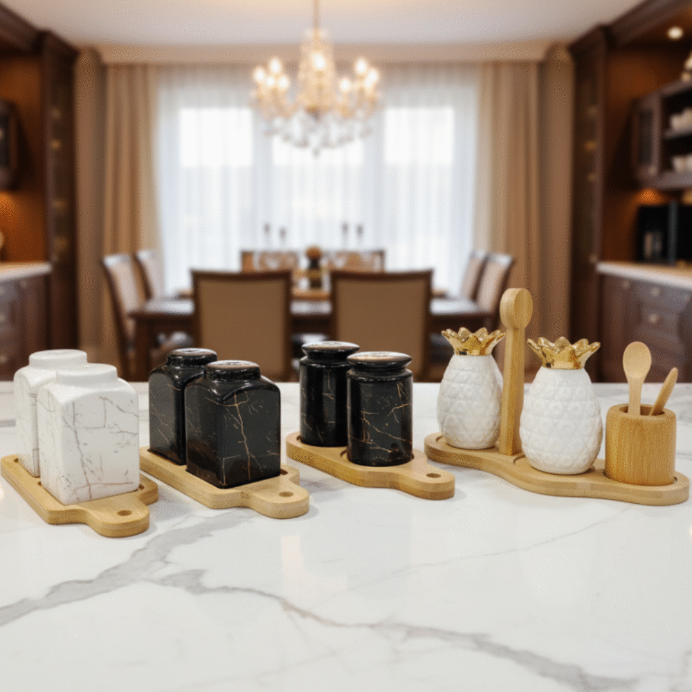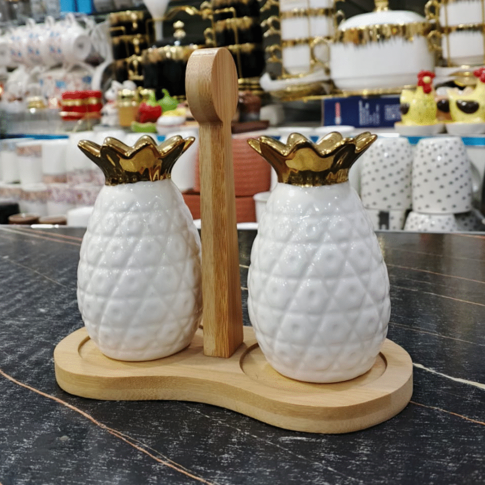 Add a touch of sophistication to your kitchen or dining table with our Luxury Ceramic Salt Shaker & Spice Jar Set. This beautifully designed set includes a variety of ceramic containers perfect for salt, pepper, and spices. The set features high-quality ceramic jars in sleek black and white marble patterns, as well as a charming pineapple-shaped shaker set with golden crowns — perfect for adding a royal touch to your tabletop.