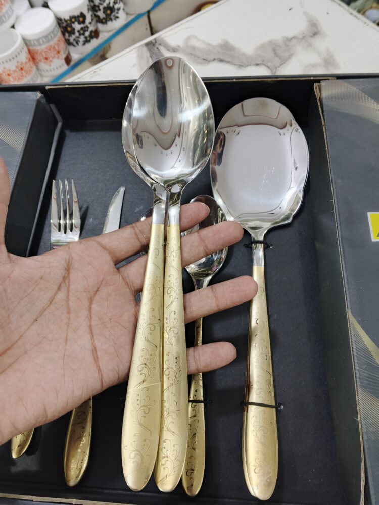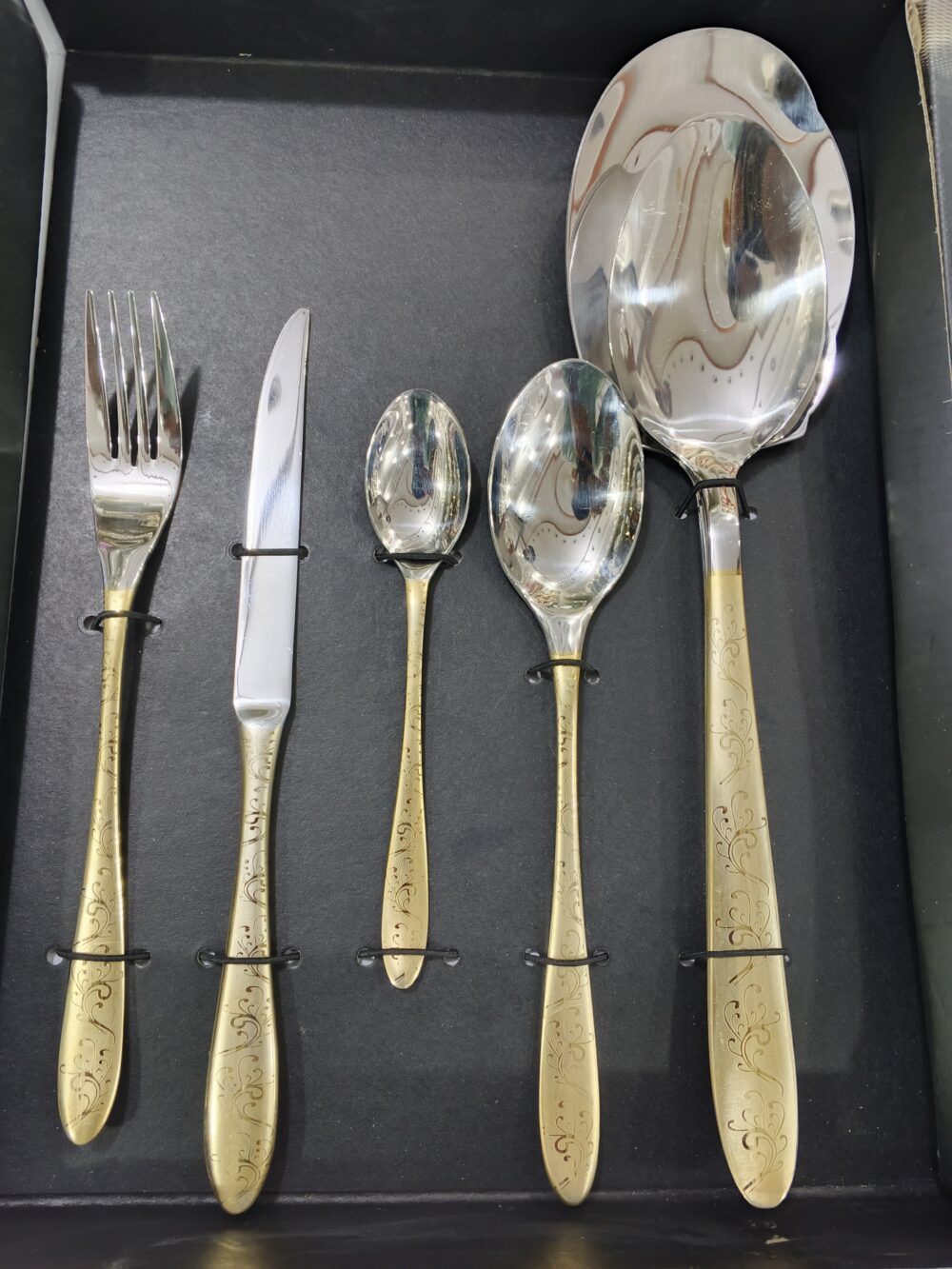 Elegant gold-plated cutlery set with intricate detailing – perfect for fine dining, parties, and luxury table settings.