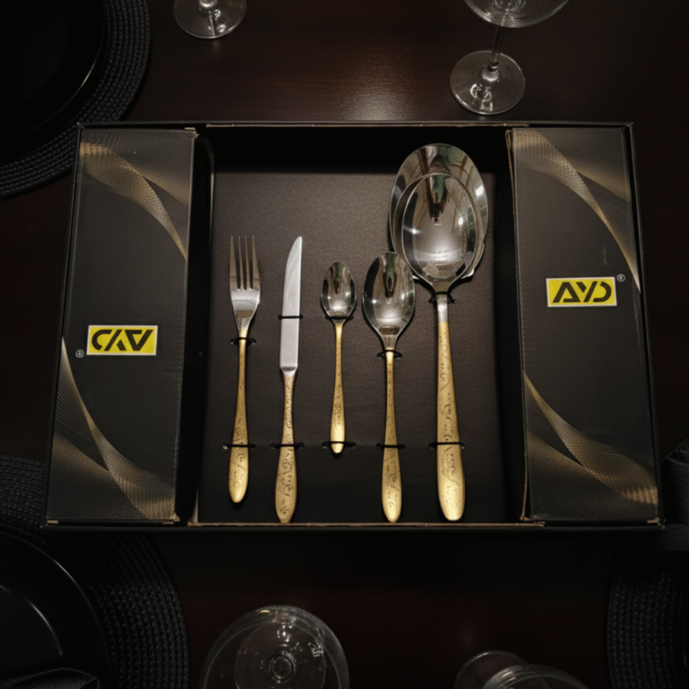 Transform your dining table with our Luxury Gold-Plated Cutlery Set – a masterpiece of style and sophistication. Expertly crafted from premium stainless steel and finished with a radiant gold-plated shine, this set exudes timeless elegance while ensuring lasting durability.
