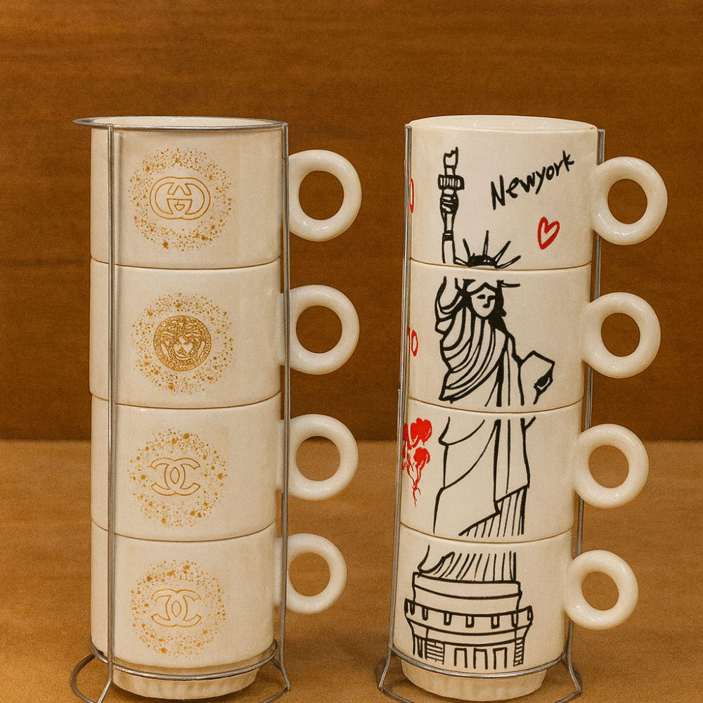 Each set includes 4 high-quality ceramic mugs, beautifully arranged in a space-saving metal stand that keeps them neat, stylish, and easy to access.