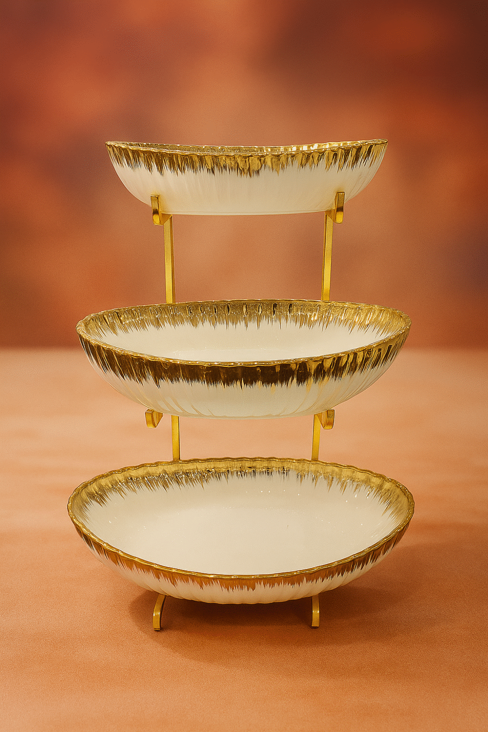 Add a touch of luxury and grandeur to your dining table with the Royal Elegance 3-Tier Serving Bowl Stand. Crafted with high-quality ceramic bowls and premium golden metal frame, this piece is perfect for displaying desserts, fruits, snacks, or appetizers in style. The gleaming gold accents and scalloped rim design bring a sense of opulence and refinement to any gathering. Ideal for parties, weddings, or festive dinners, the tiered structure ensures space-saving presentation while creating an eye-catching centerpiece. Durable, elegant, and timeless — this set transforms your serving experience into a statement of sophistication.