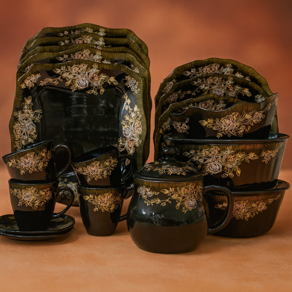 Each piece features a glossy black finish, highlighted with golden and pastel floral patterns, giving the set a timeless regal charm. Crafted from durable, heat-resistant ceramic, it ensures long-lasting strength, smooth texture, and effortless cleaning.